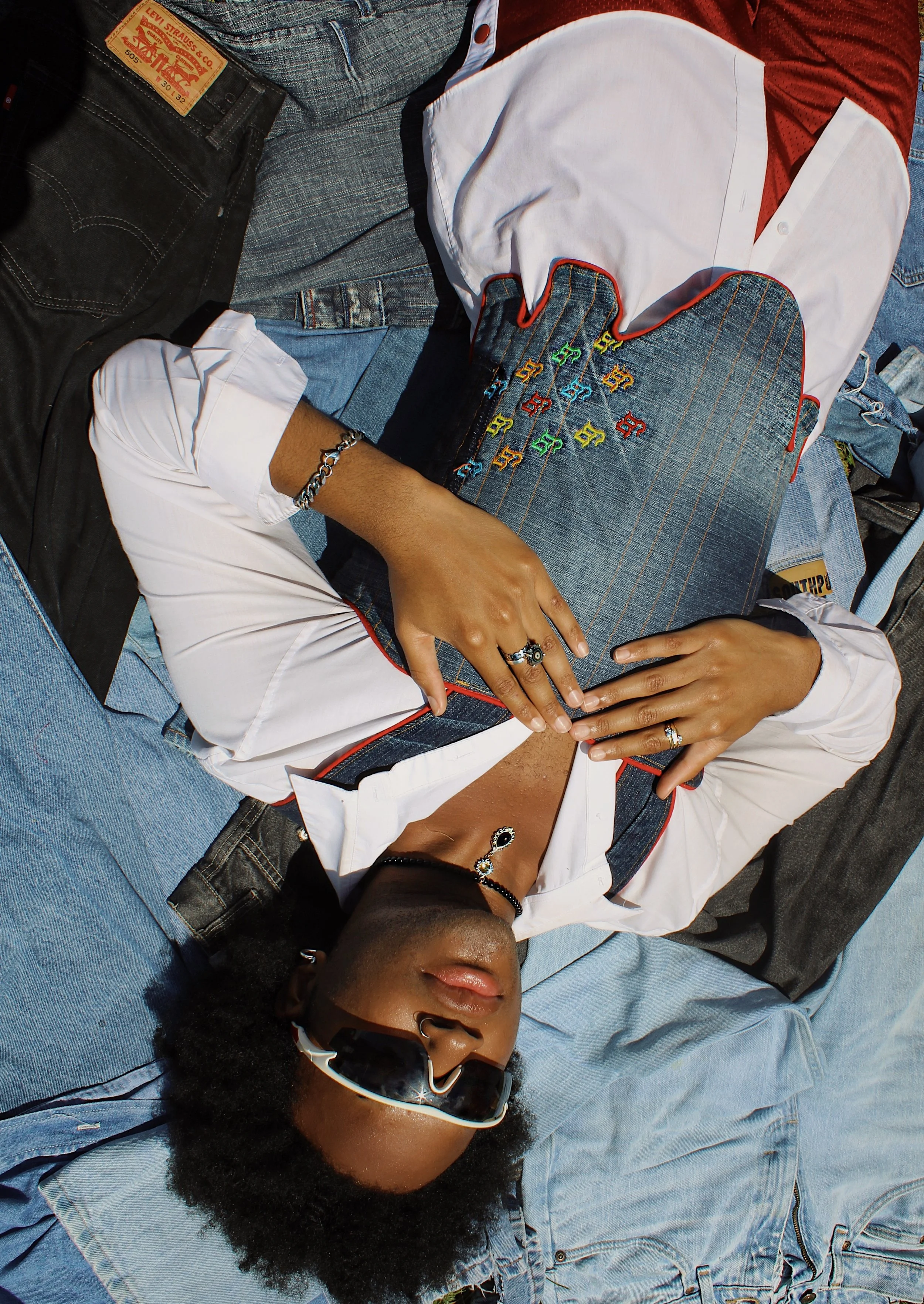 The piece featured an Elizabethan corset constructed from upcycled vintage Coogi jeans, staged on a bed of denim to symbolize the circularity and enduring legacy of the material. Through this work, I explored themes of absence, identity, and sustainability—reclaiming historical silhouettes with a contemporary, waste-conscious approach.